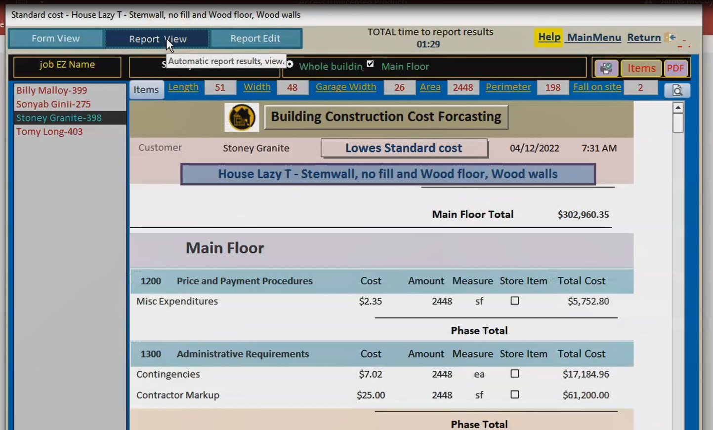 Our construction report is 8 - 9 pages, professionally displayed for any banker or associate representing over 300 + items. On the average you will have 123 items from Lowes or Home Depot, you will be buying. To look all these up every time will take several hours. Save you time and put yourself out on the job fast. Quote someone on a home building cost with confidence in under an hour.
